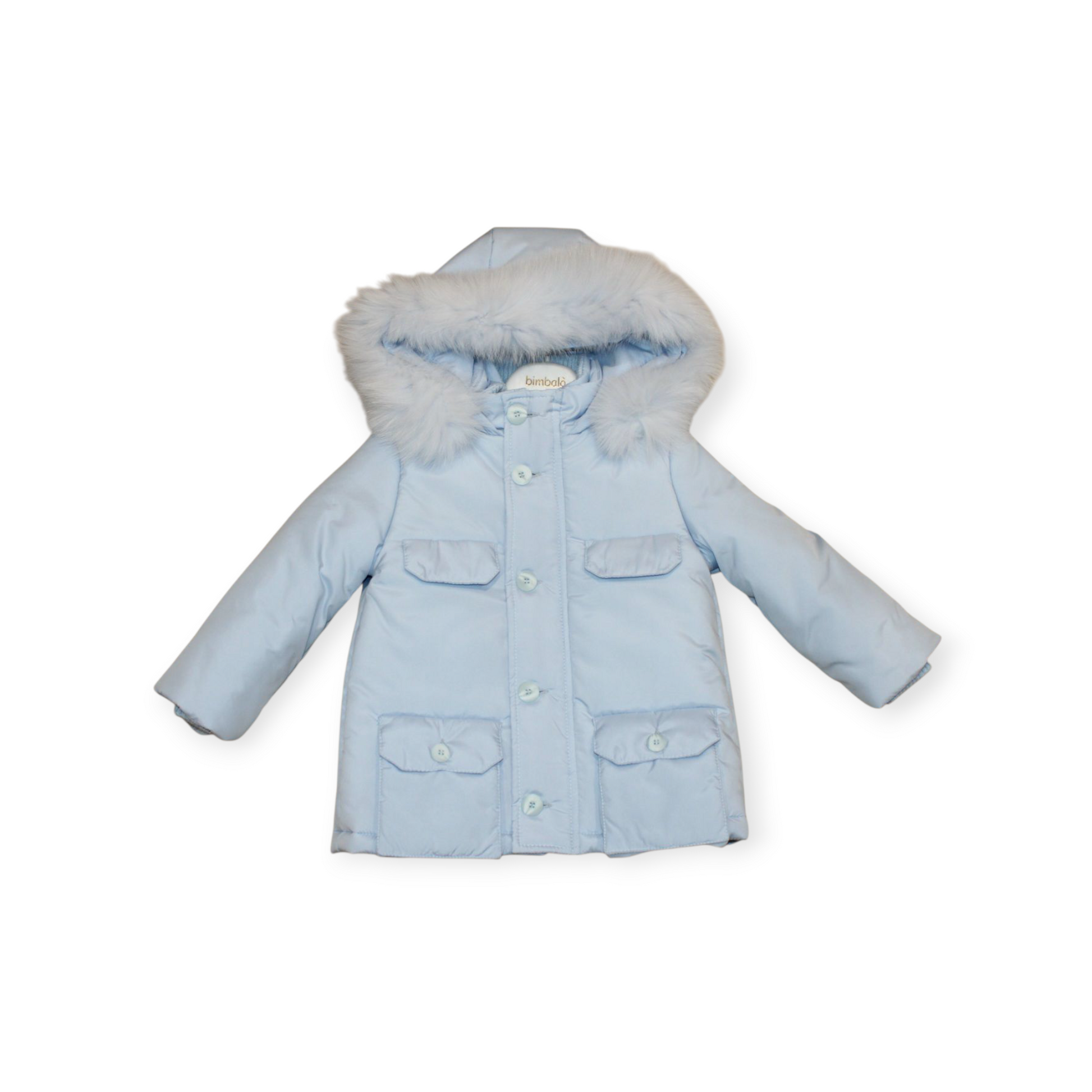 Boys bimbalo blue coat with fox fur trimmed hood with zip down the front and buttons and 4 pockets