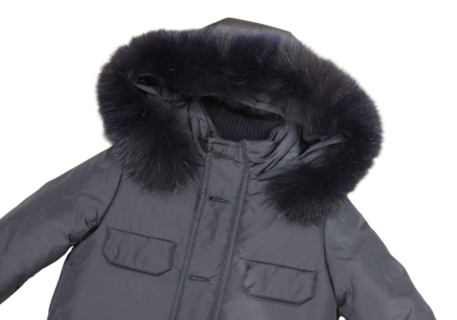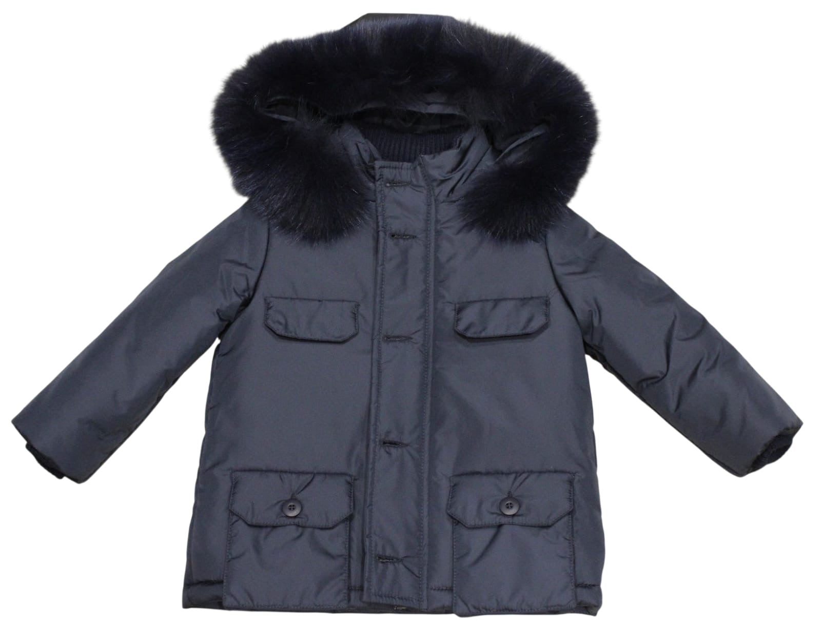 Boys Navy Coat With Pockets Also Zip And Button Down Front And Fur Hood