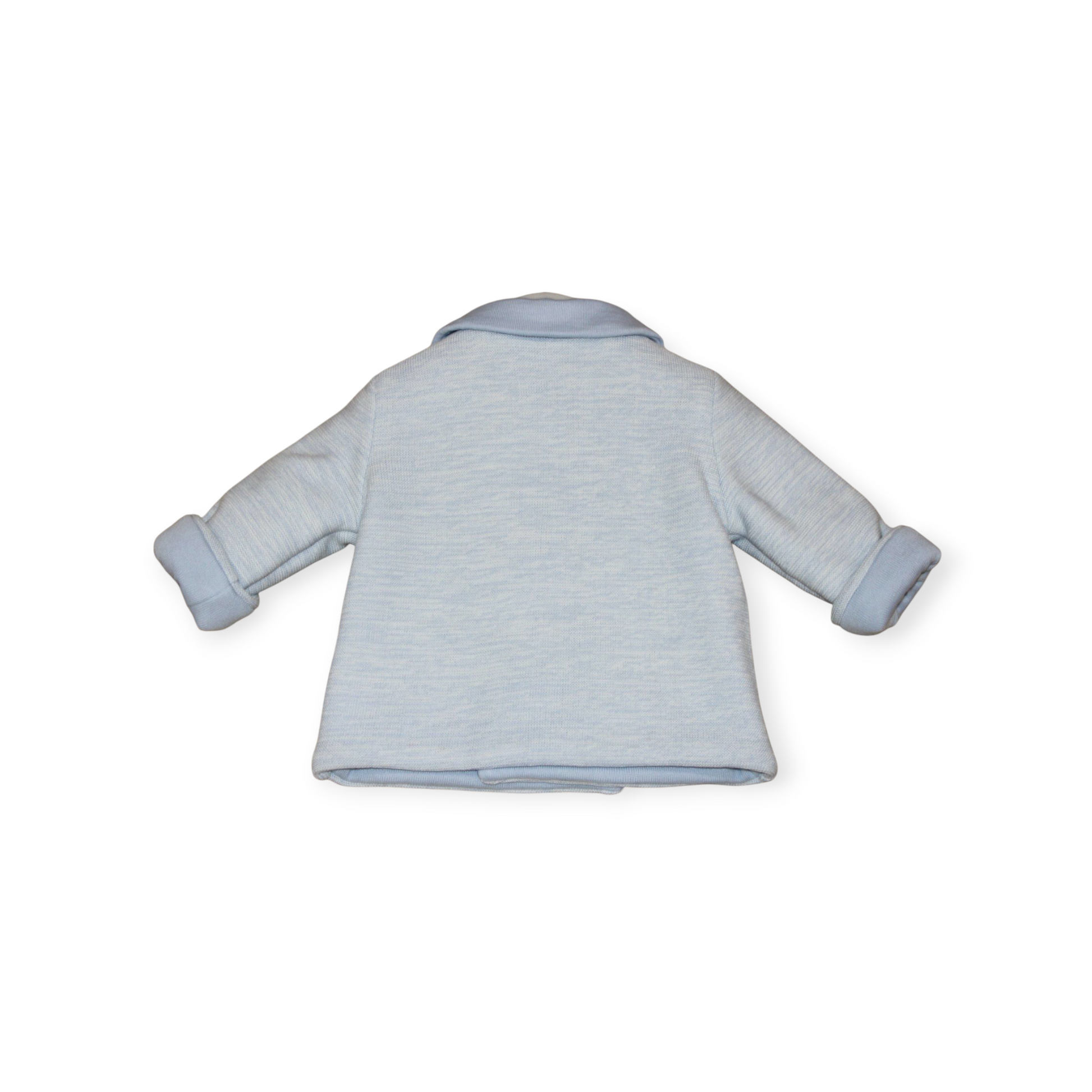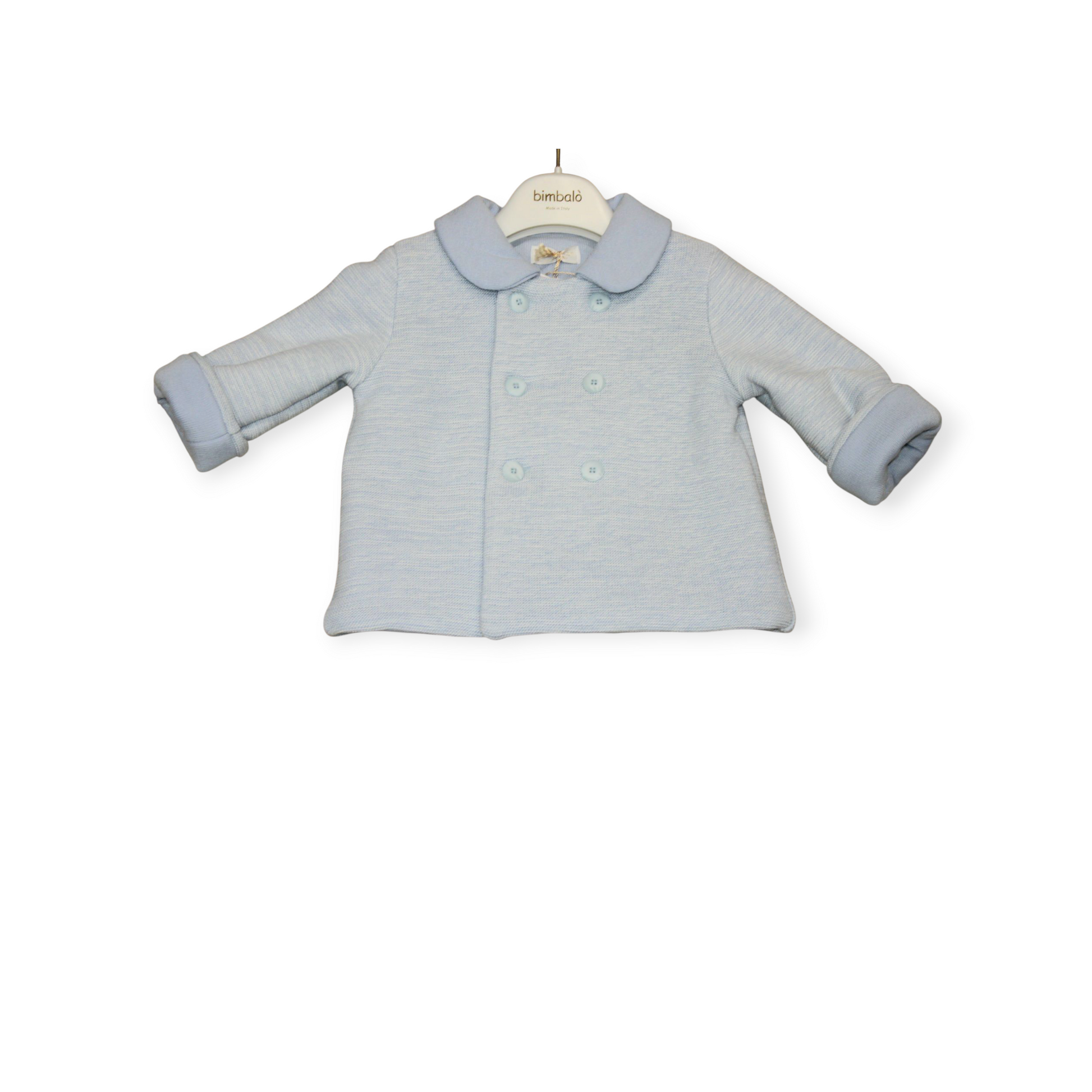 Blue knitted bimbalo double breasted coat with matching hat