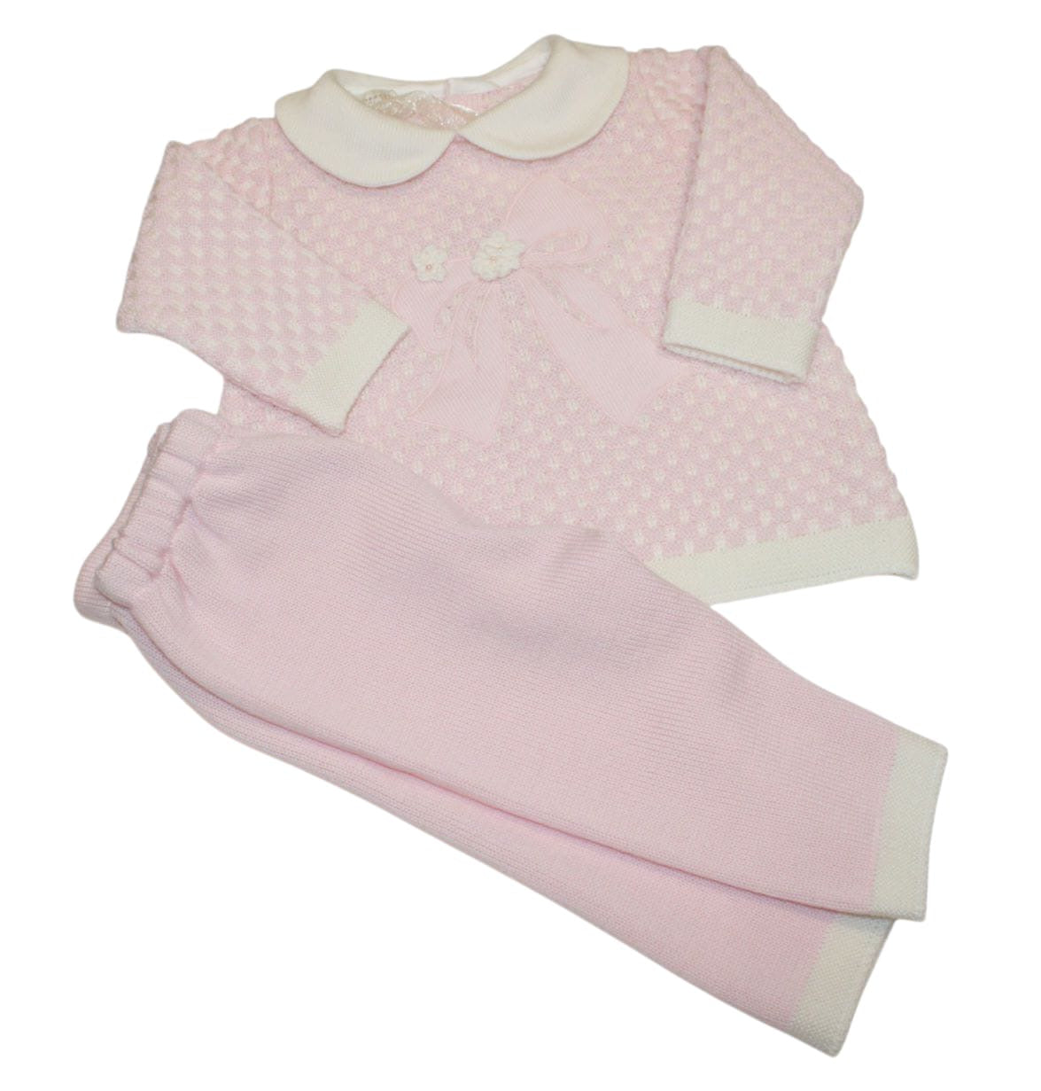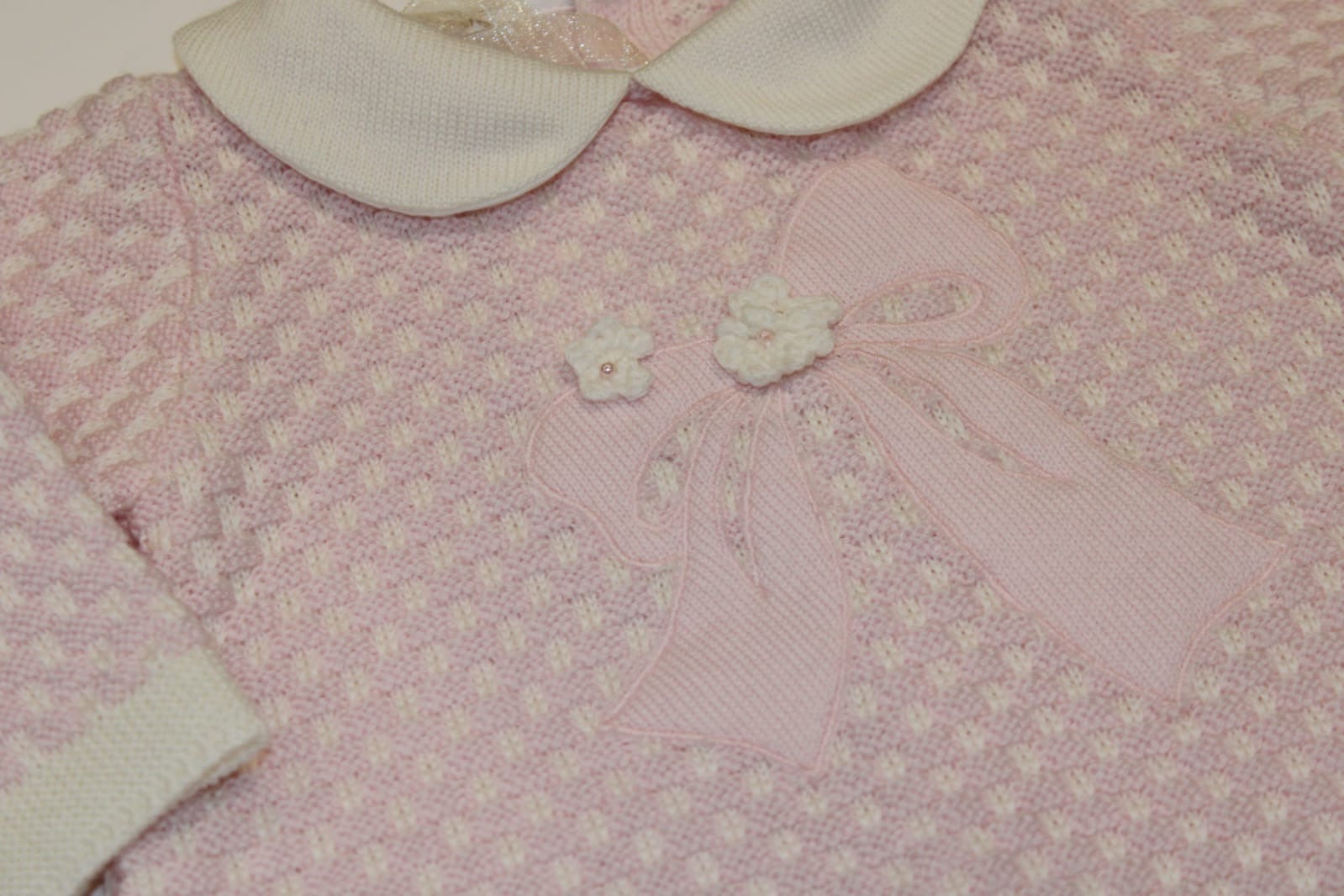 Pink and cream bimbalo 2 piece knitted set with beautiful bow detail with flowers and pink pearls with cream collar