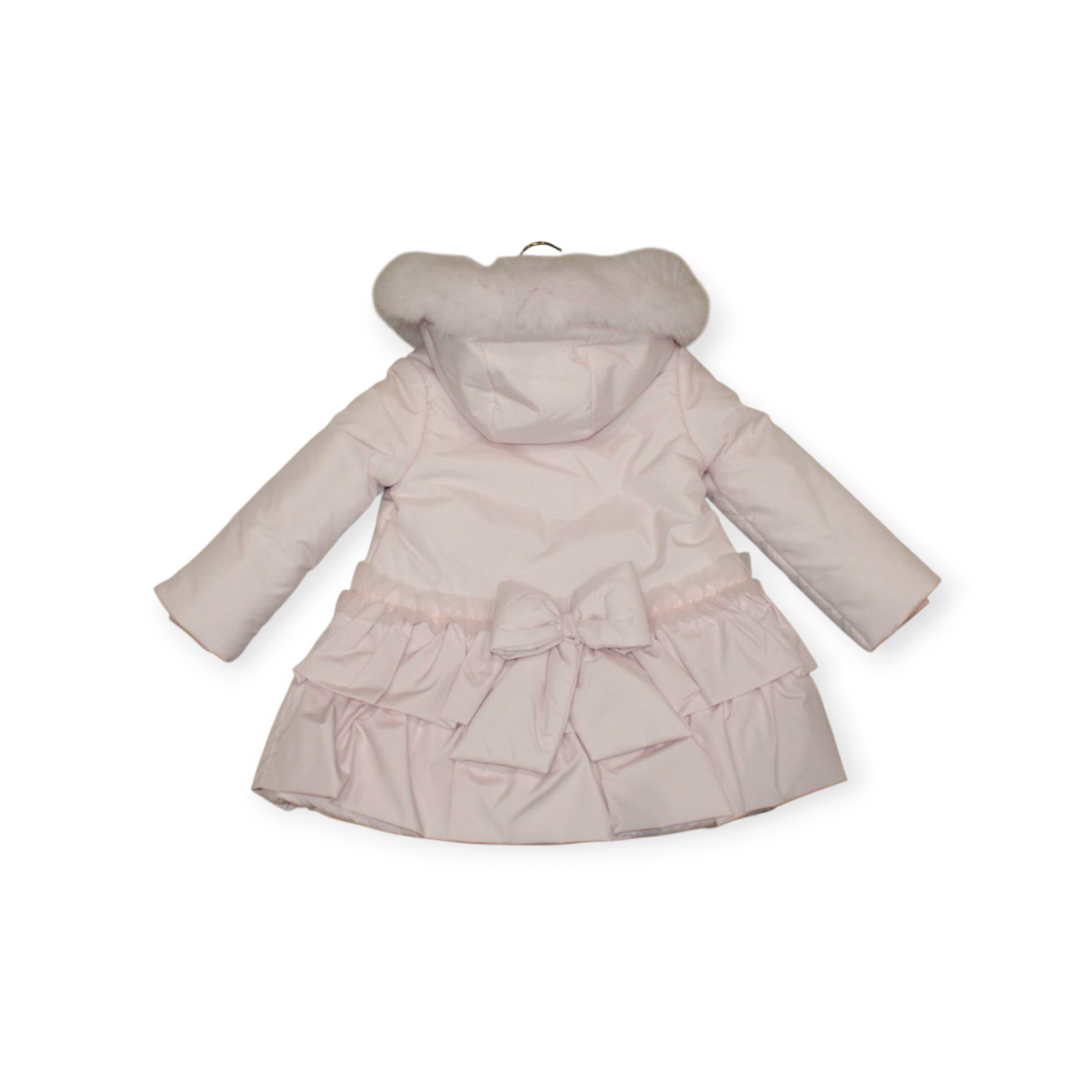 Pink bimbalo coat with fox fur hood with Frill detail and bow on the back with bimbalo writing in crystal detail