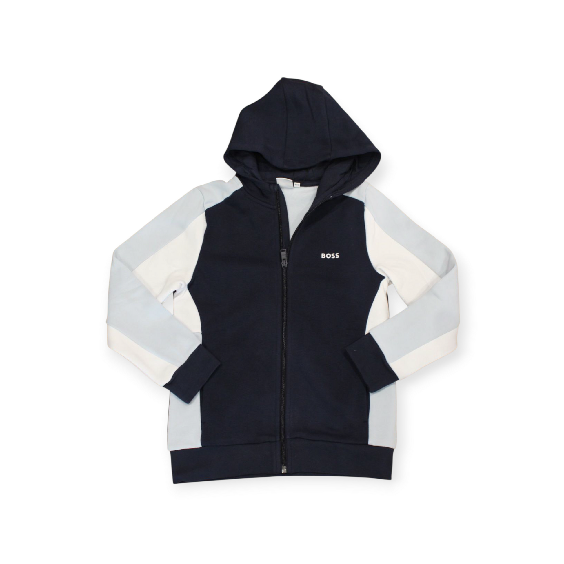 Boss hoodie jumper with front zip and blue and white stripe detail down arm