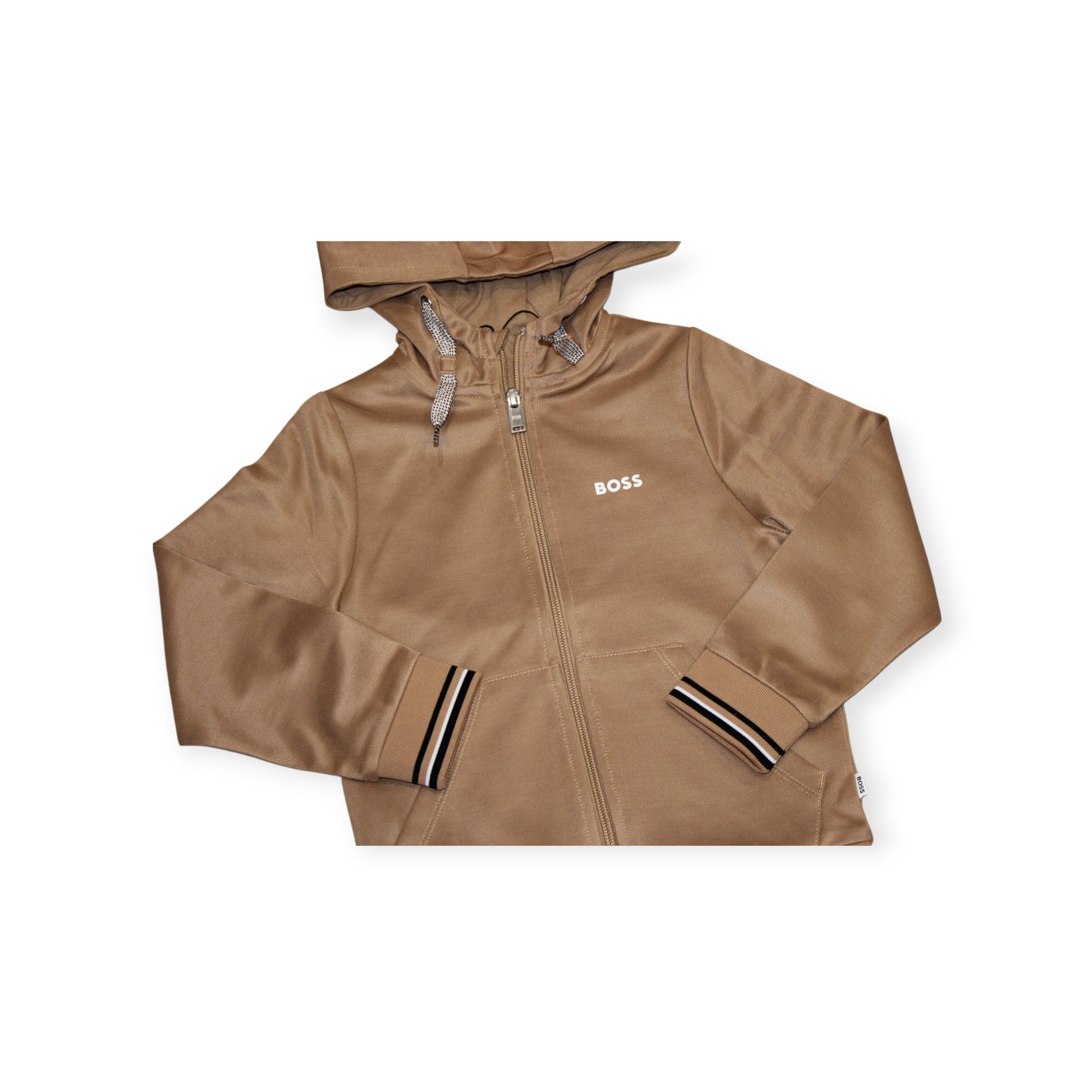 Boys boss tan tracksuit trimmed with black and white around the cuff and with boss logo on the left side in white
