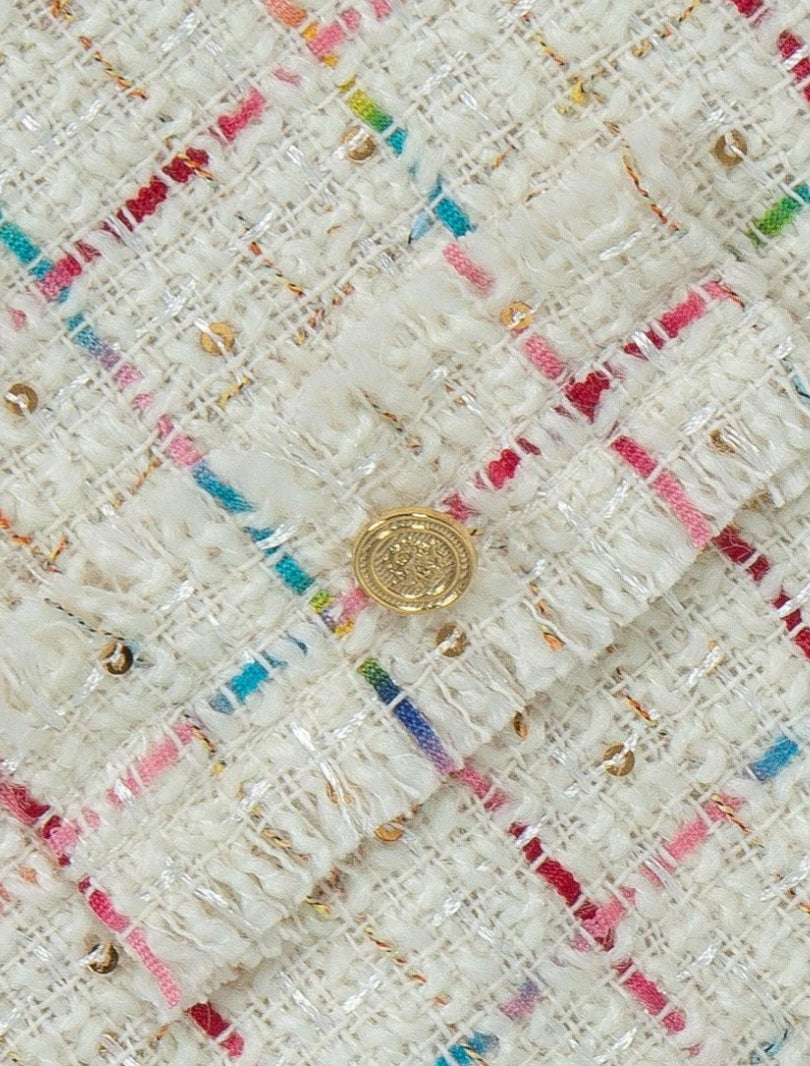 Expertly designed by Lapin house, the long sleeve tweed cream and multi-colour dress boasts 2 gold buttons on the front. A perfect blend of comfort and sophistication for any occasion.