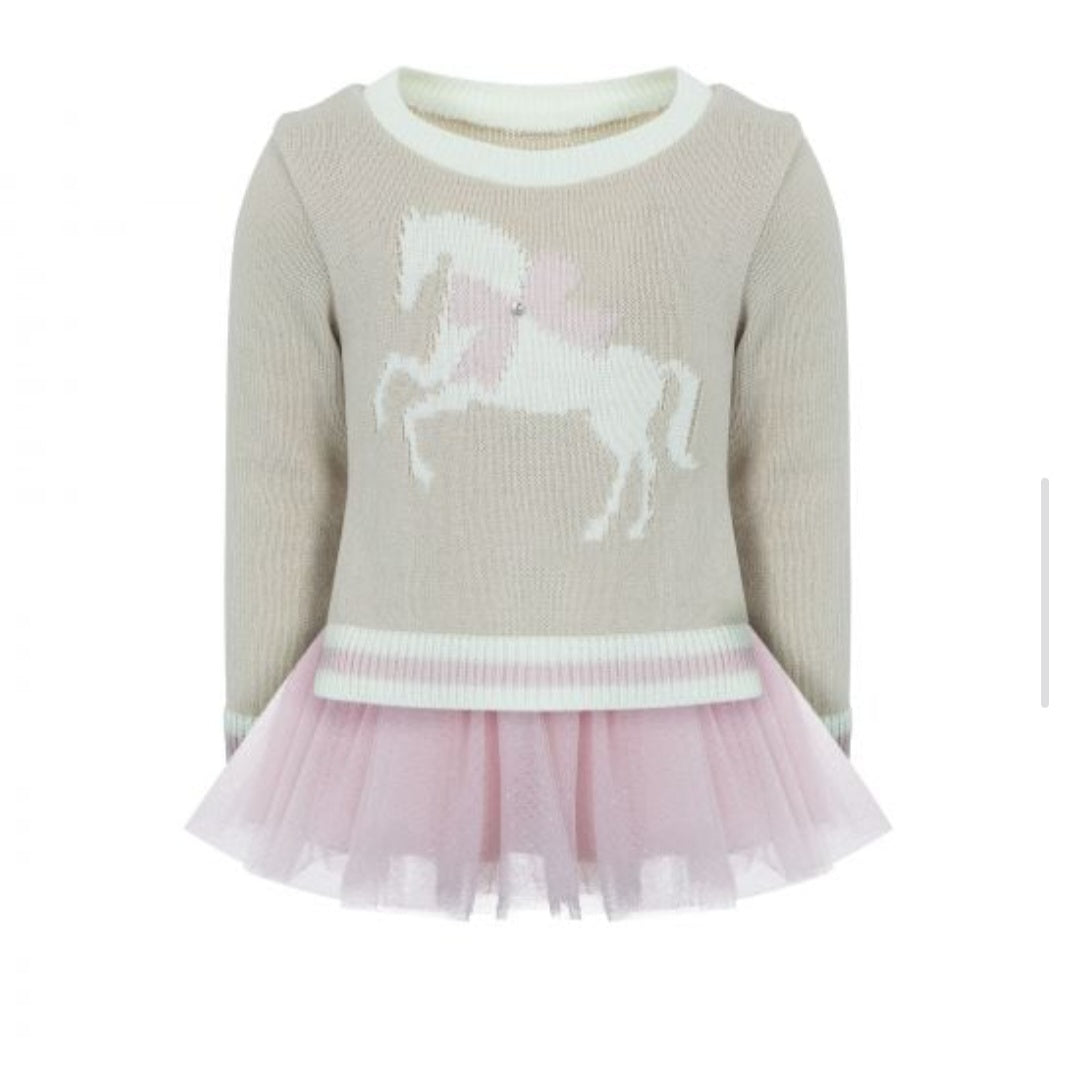 The Lapin House dress and jumper set offers a playful yet stylish look for your little one. The pink tutu dress adds a touch of whimsy while the beige and pink jumper boasts a charming horse design. Made by Lapin House, known for quality and design, this set is perfect for any occasion.