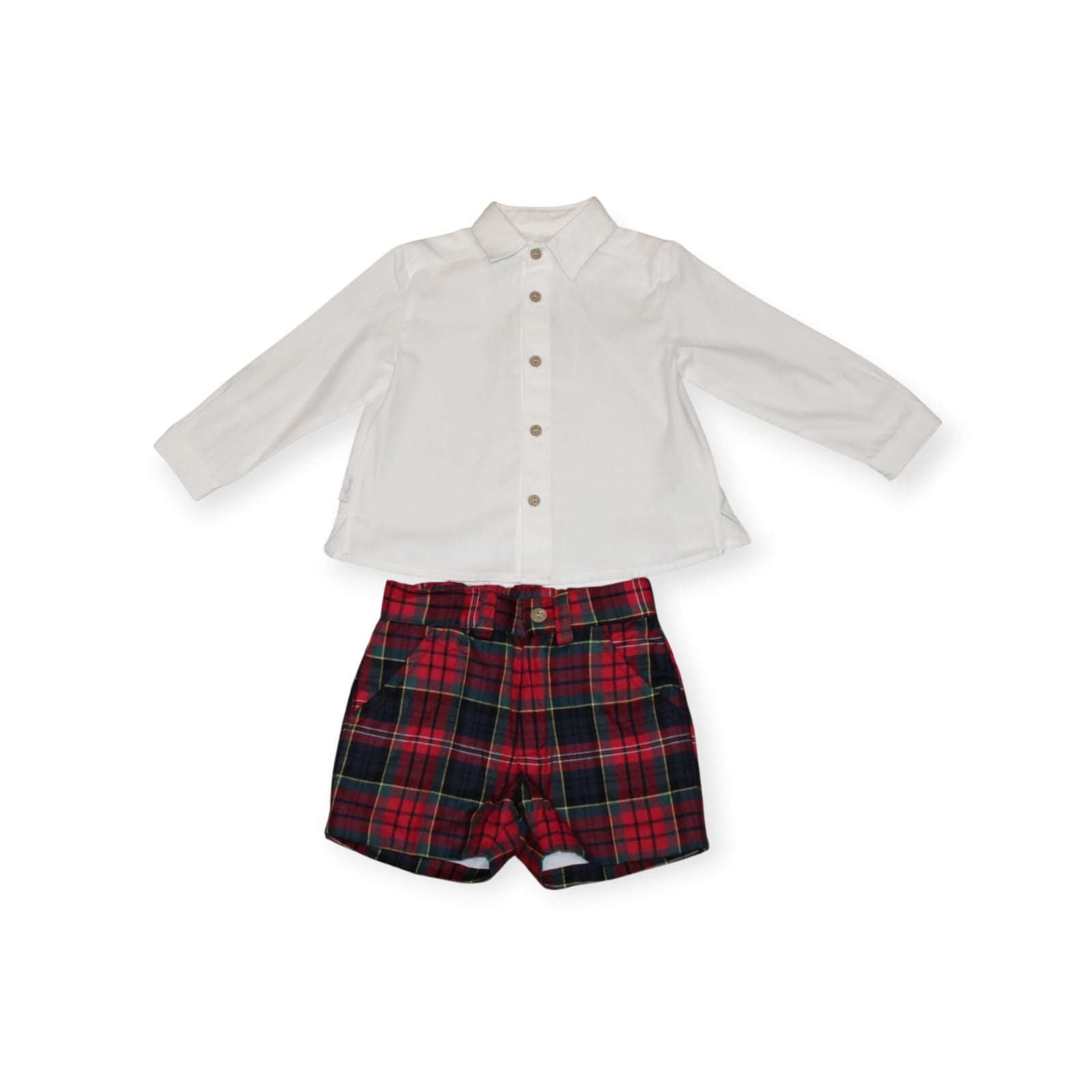 Martin aranda Boys outfit with red and bottle green shorGet your little one looking sharp in this MARTIN ARANDA Boys Outfit. The red and bottle green checked shorts add a touch of style and the white shirt adds a touch of class. Made from high quality materials, this outfit ensures comfort and durability for all-day wear. Perfect for any occasion!ts