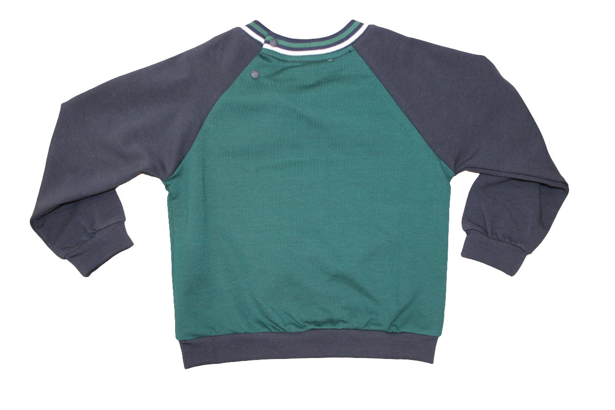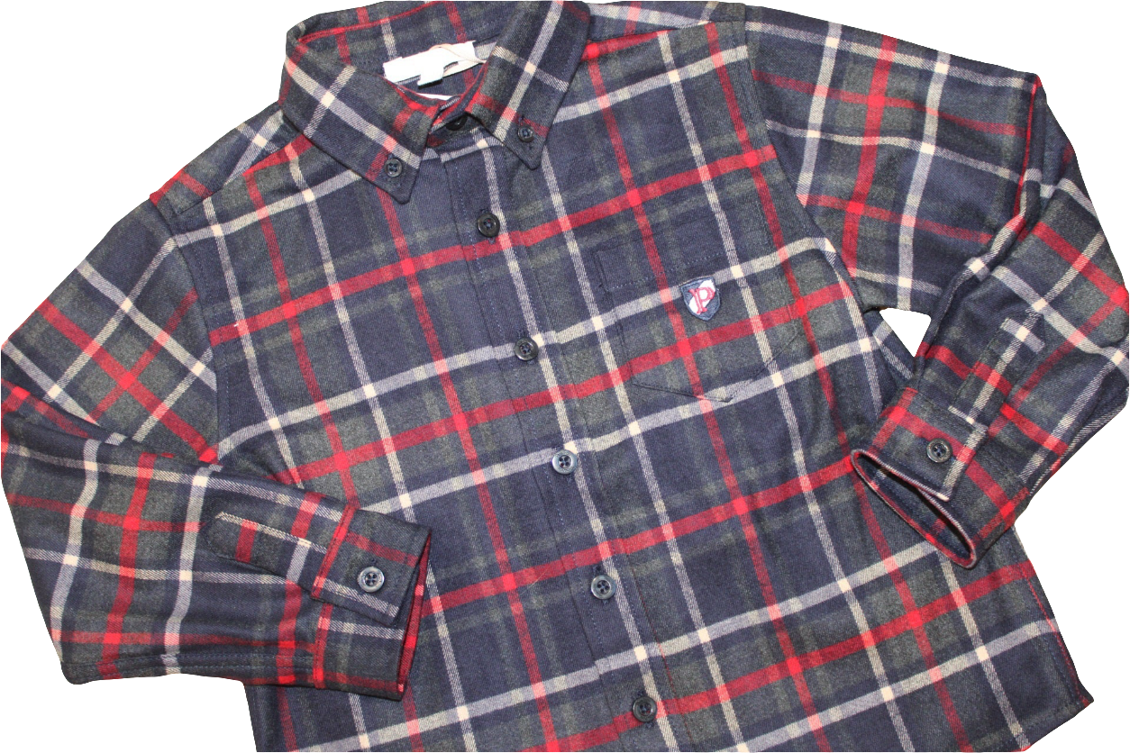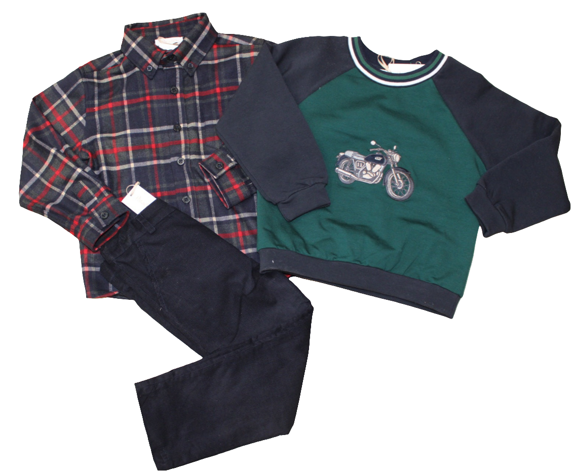 Boys navy cords navy green and red checked shirt & navy and green jumper with motorcycle detail on front