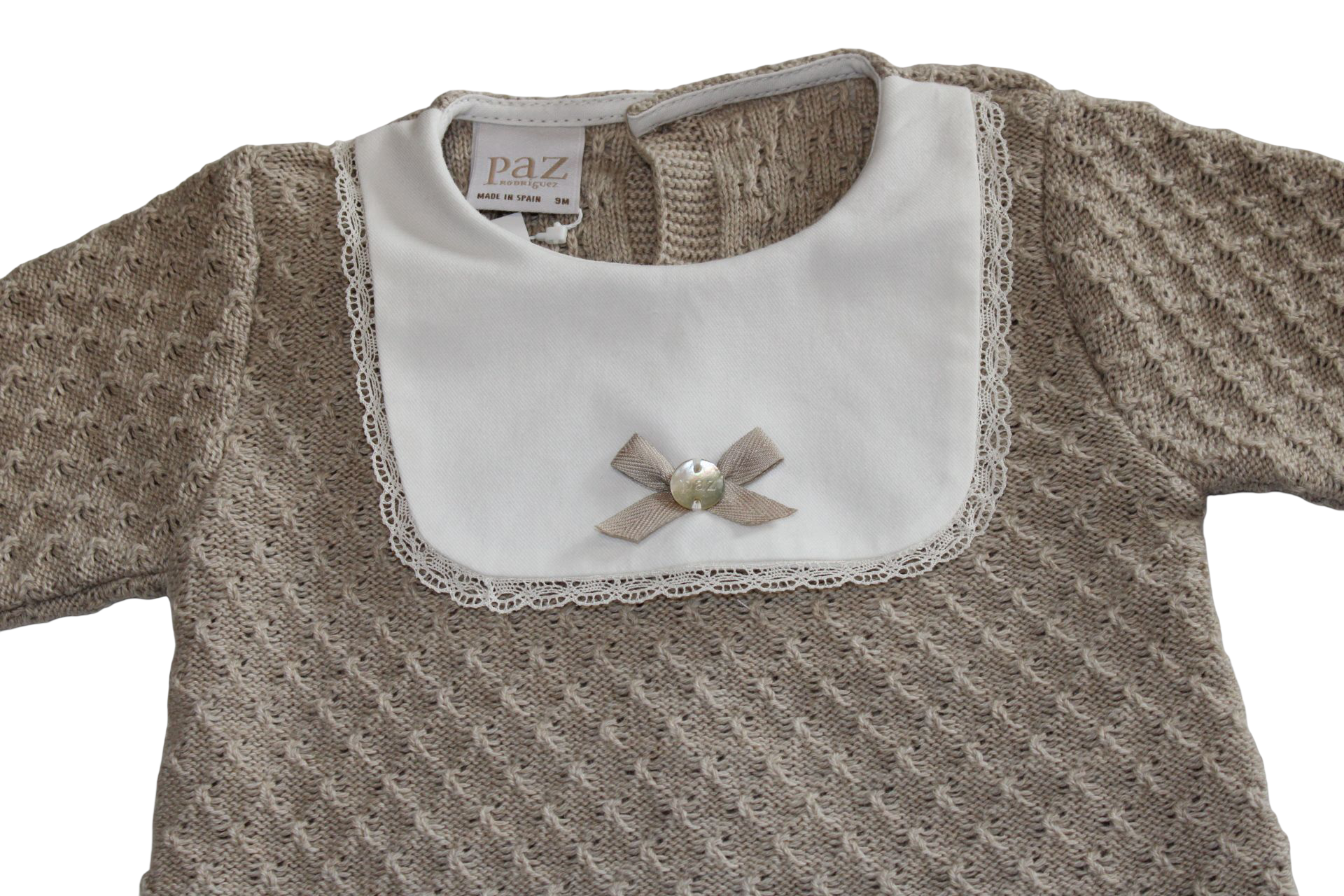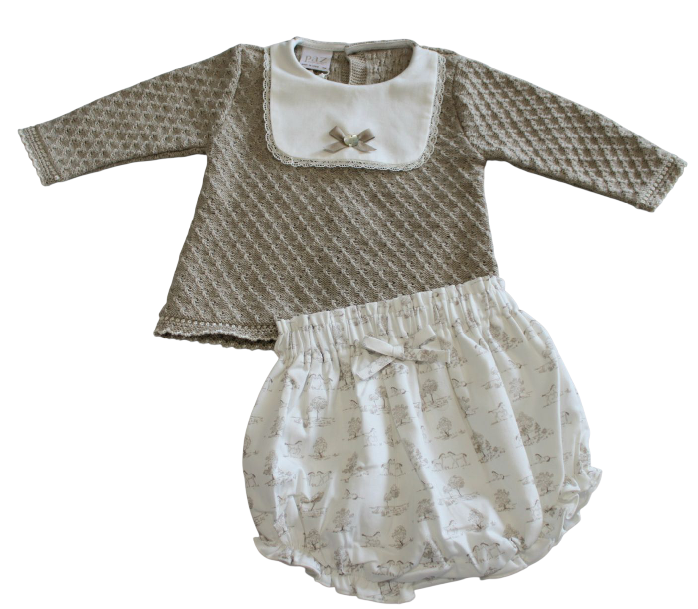 2 piece paz Rodriguez beige and cream set with bib design detail on top and crawler knickers