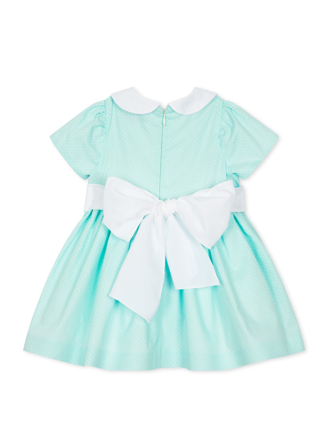 The Piccola Speranza turquoise smocked dress features a refined design, complete with a white tie bow at the back. This garment combines aesthetic appeal with comfortable wear, ensuring ease of movement. The smocking technique provides a tailored fit while enhancing breathability, making it suitable for varied occasions.