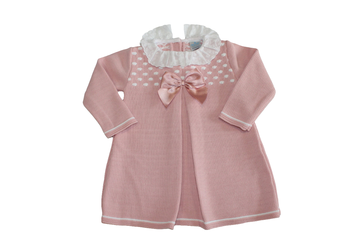 Rose Pink Knitted Dress With Frill Collar & Bow With Matching Knitted Coat.
