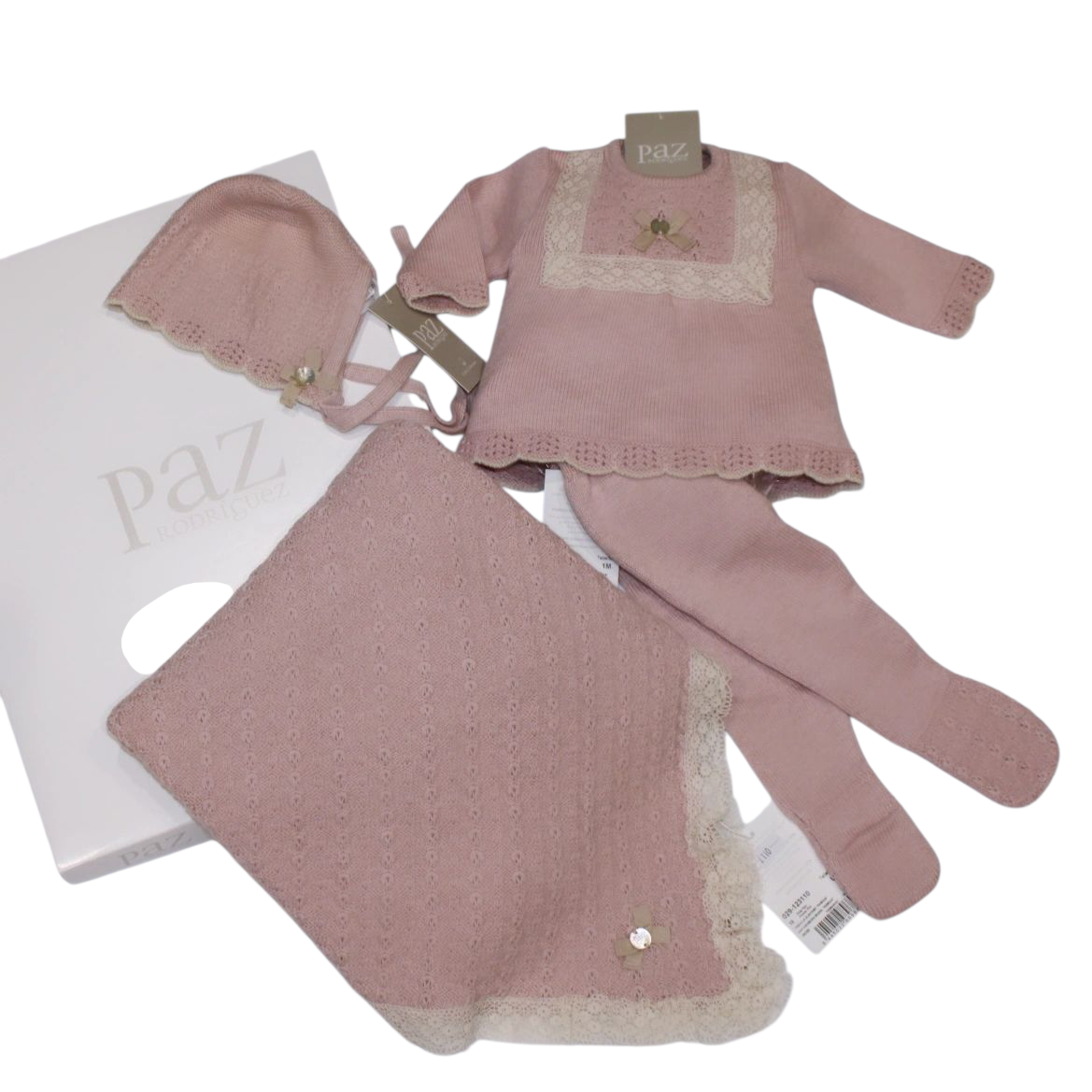 Pink Paz Rodriguez knitted set with bonnet and matching shawl trimmed with cream lace and bow detail.