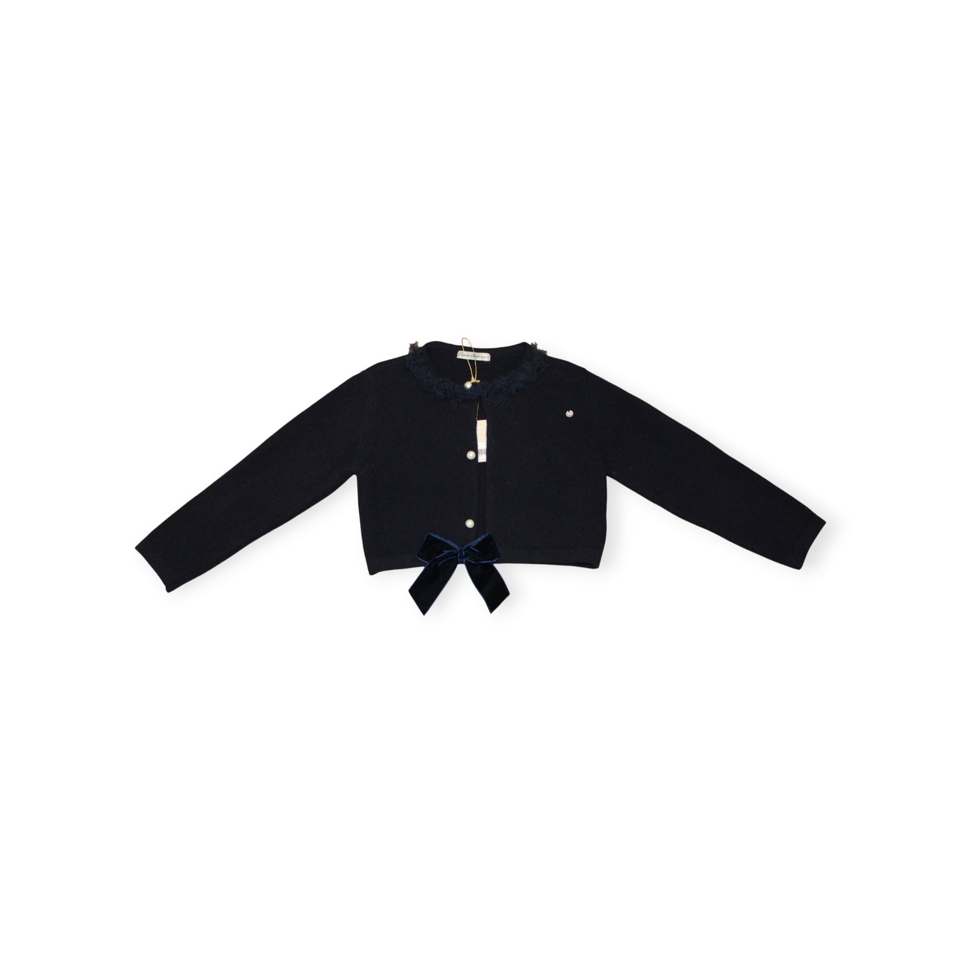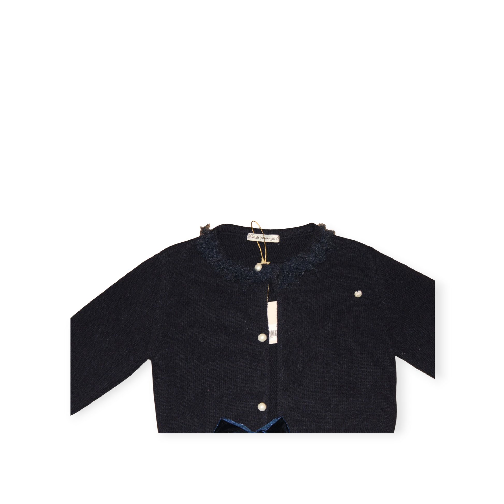 Girls piccola speranza 3 piece outfit navy pleated skirt with a velvet bow on each hip cream blouse with pearl buttons and frill detail down the front with matching cardigan with velvet bow at the bottom