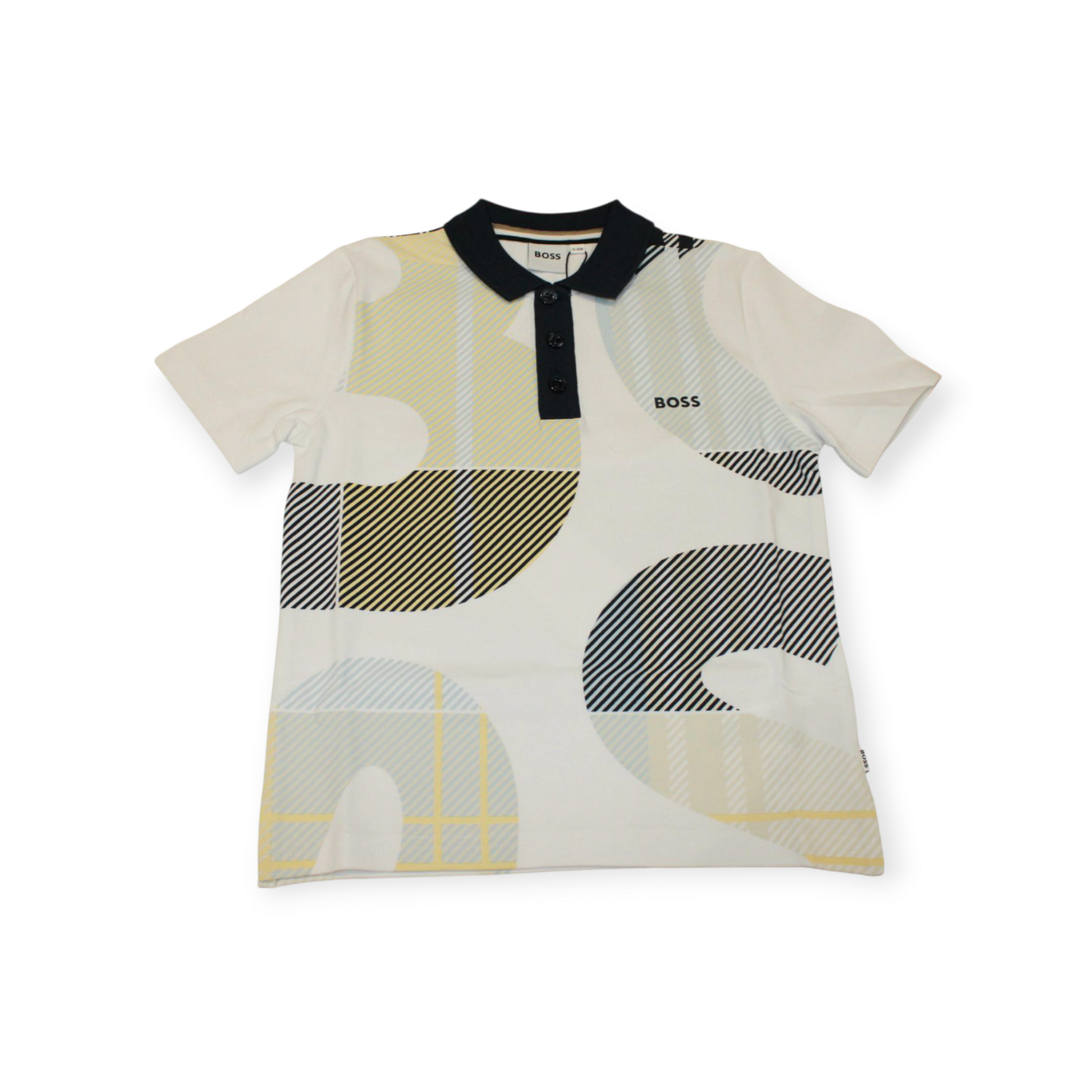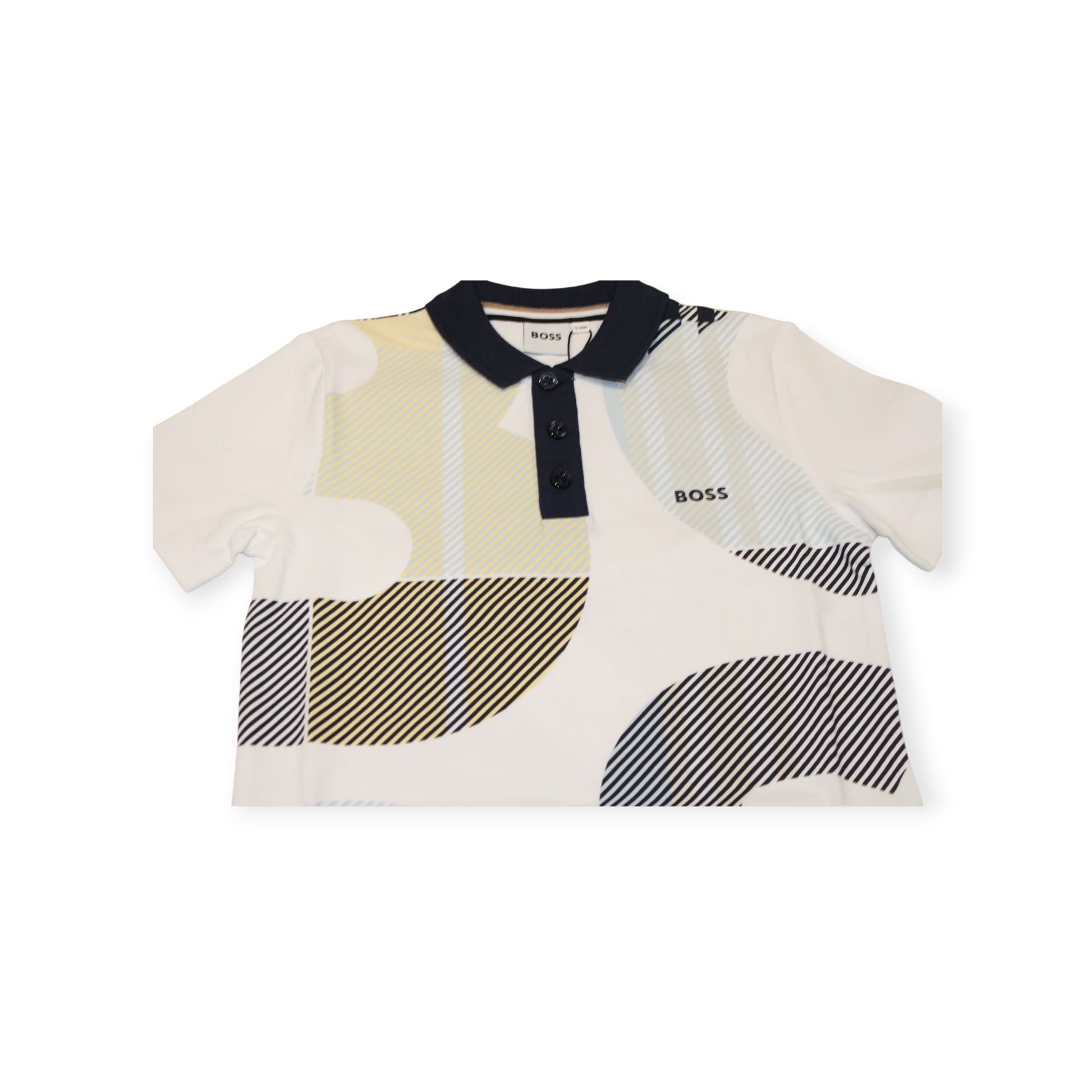 Boss Boys polo shirt white with navy collar with lemon navy and blue design