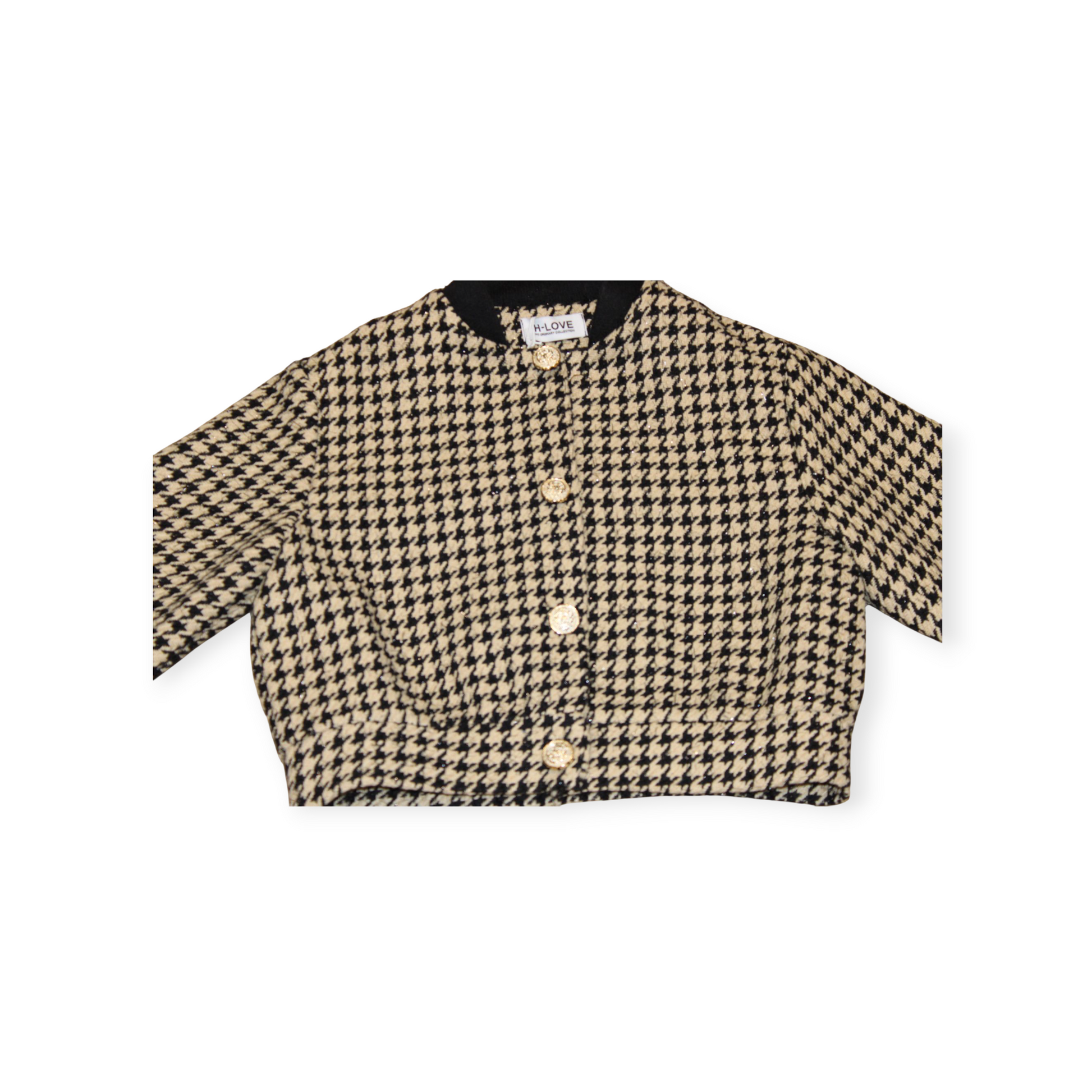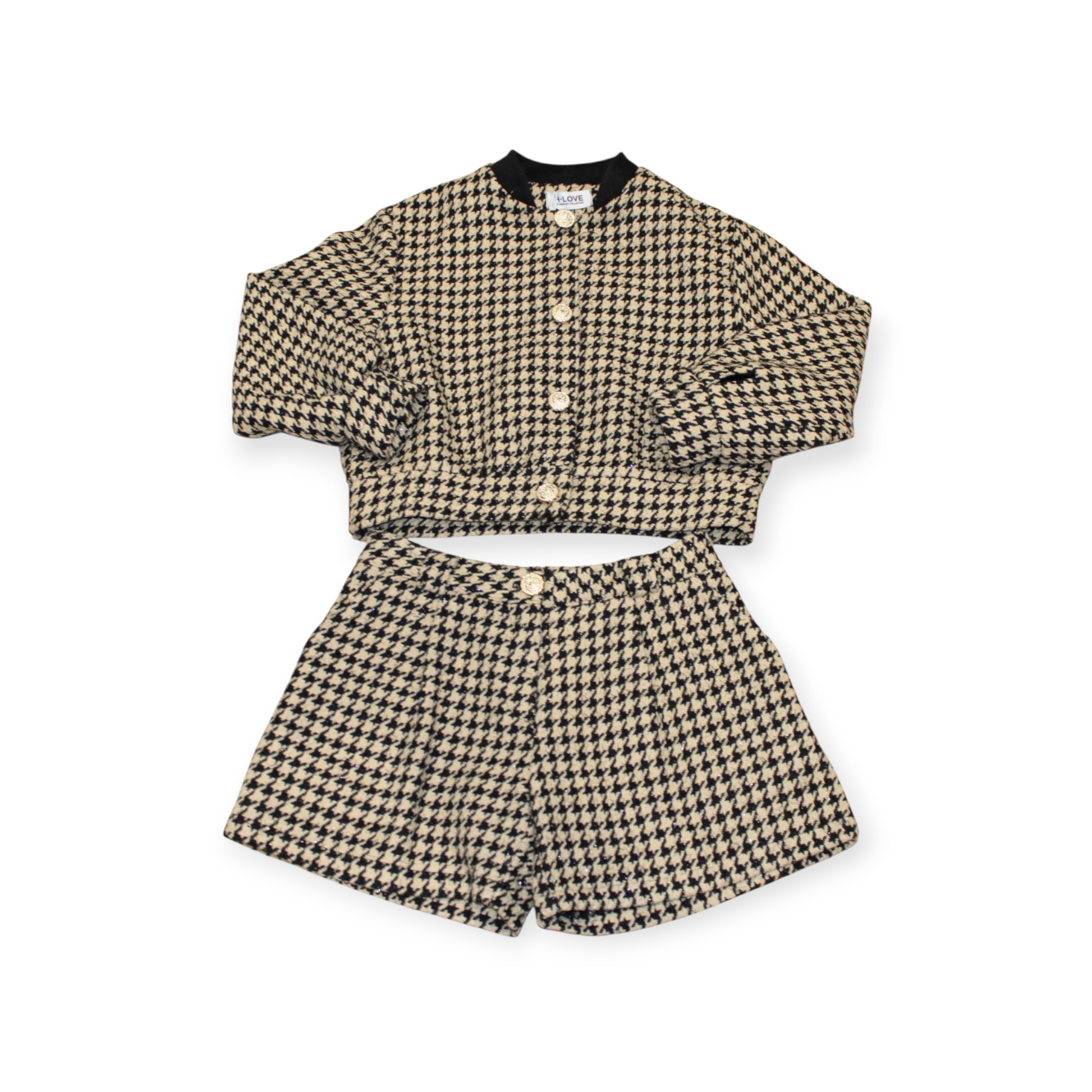 "Upgrade your style with the H-LOVE SHORT SUIT. The beige and black colors, paired with gold buttons, exude sophistication and fun. Perfect for any occasion, this short suit will elevate your wardrobe and keep you looking stylish."