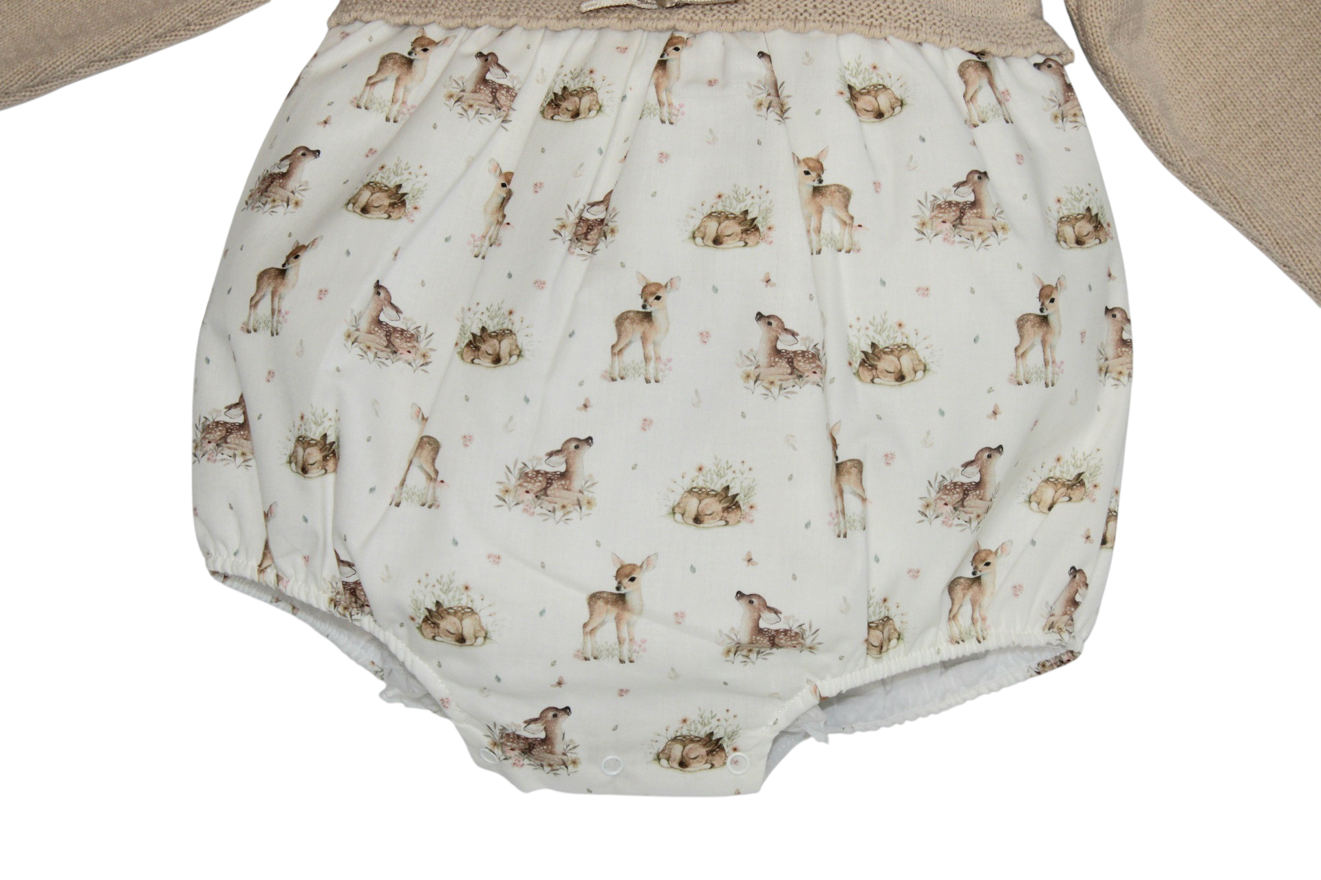 The Rigola girls romper features a beige knitted top and ivory romper bottom with a charming deer design. Perfect for any occasion, this romper provides both comfort and style for your little one. Stay on trend with this adorable, must-have piece for your child's wardrobe.