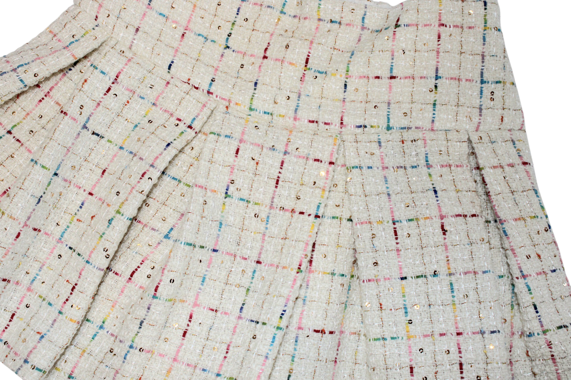 This Lapin House outfit for girls includes a cream blouse and tweed skirt adorned with a multi-color design and gold sequins. Perfect for any occasion, the high-quality fabric provides both style and comfort. Dress your little one in this elegant set and make a statement with every step.