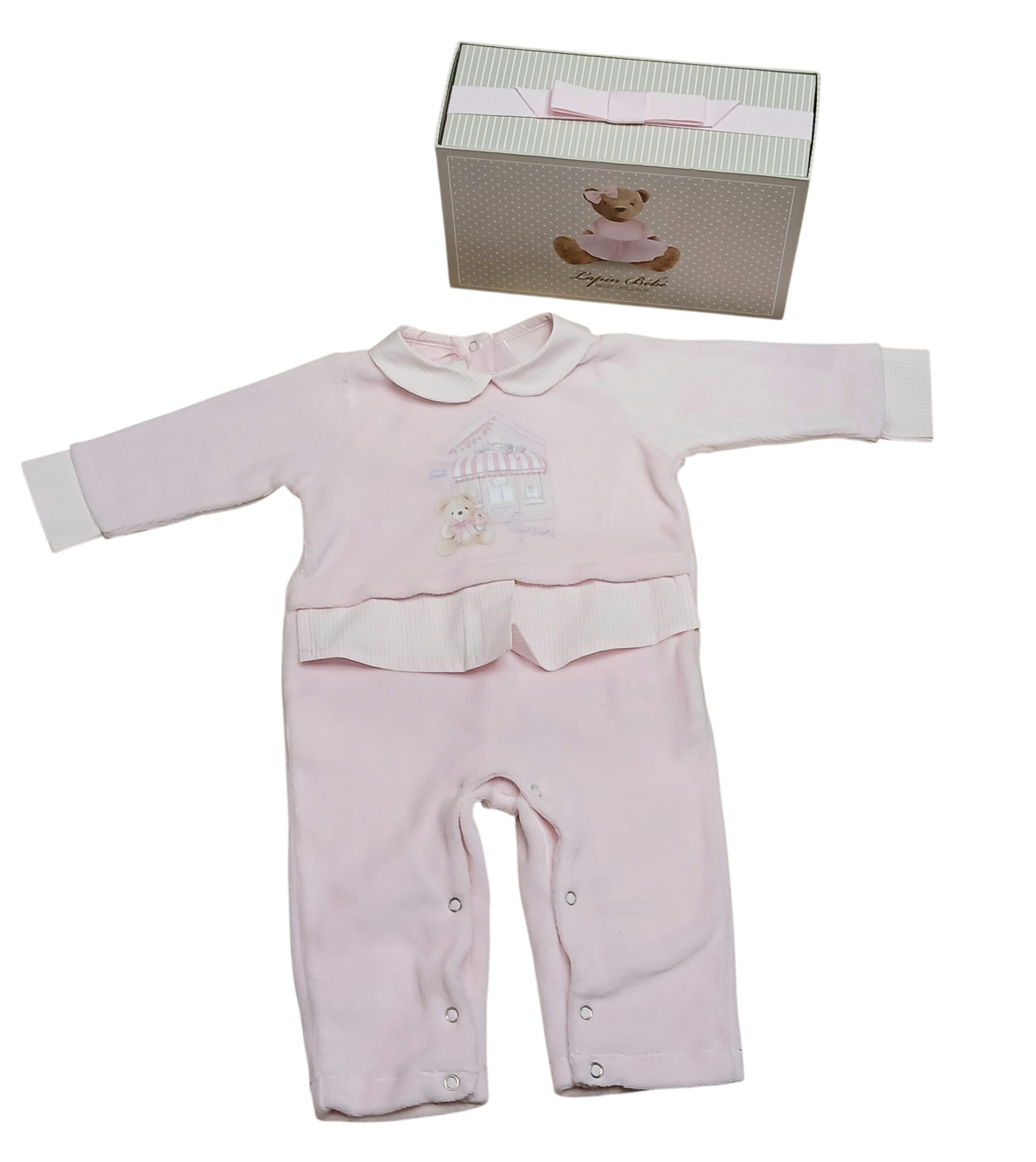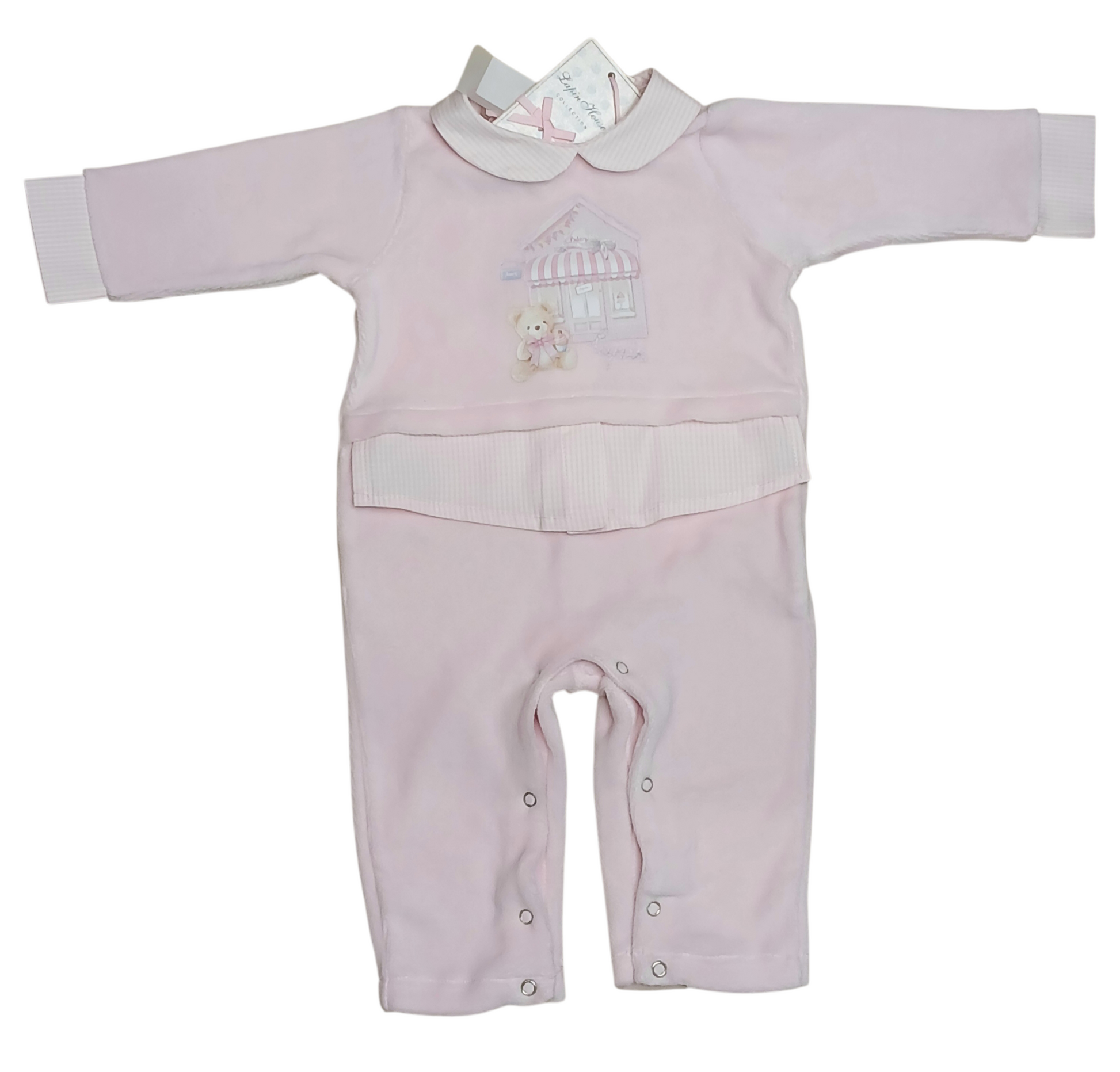 This Lapin house sweet little baby pink babygrow features a charming bakery shop and Teddy bear design on the front. With a white and pink checked collar and waist, this adorable one-piece is perfect for any little one. Keep your baby comfortable and stylish in this no feet design.
